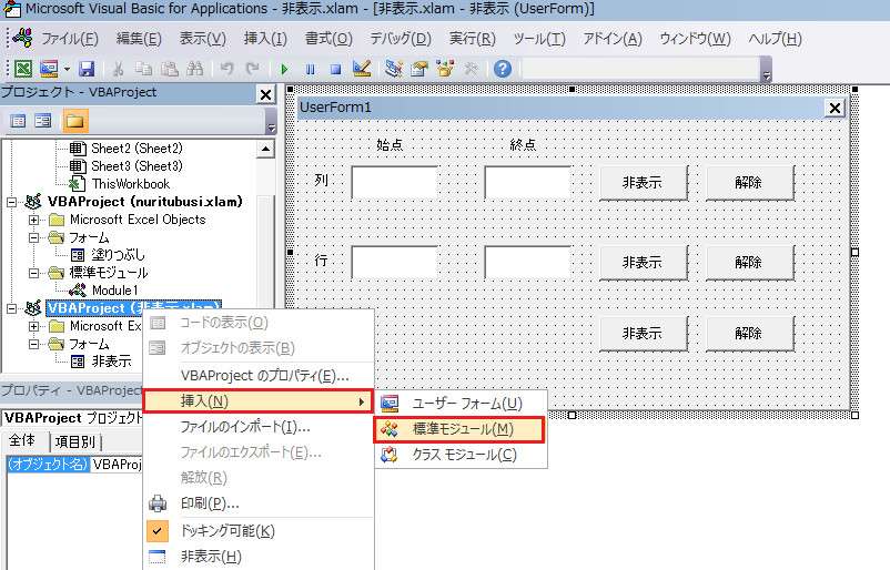 作成する場所は、VBAProjectの非表示を右クリックして下の図のように