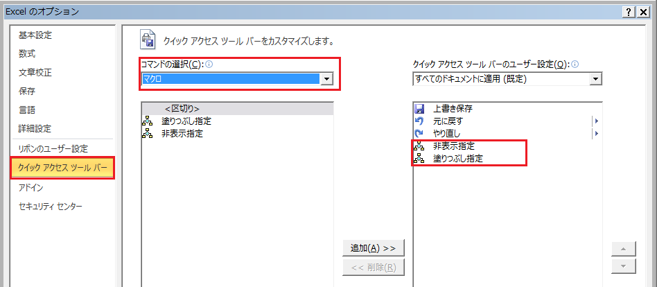 クイックアクセスツールバーへマクロの登録
