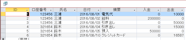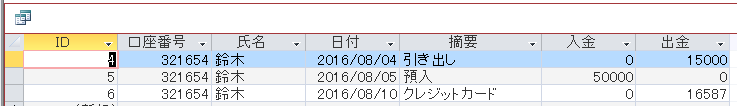 ちなみに口座番号の横の氏名は、顧客テーブルから引っ張ってきています。ですので自分で最初のクエリの設定をしますが、それ以降はデータベースが自動で氏名を表示してくれます。