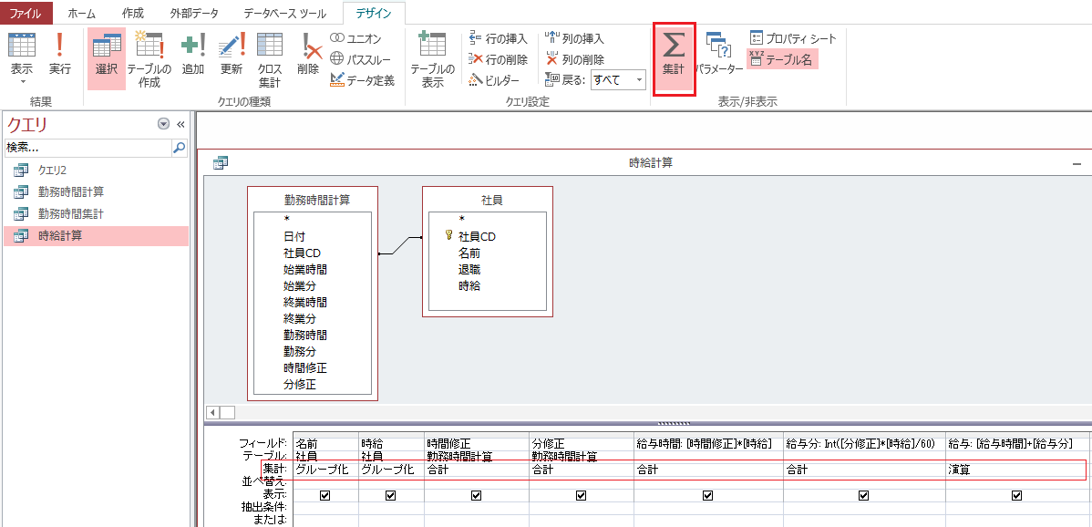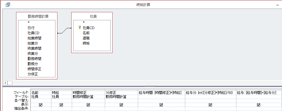 図のように勤務時間計算クエリと社員テーブルを表示して、フィールドを設定します。