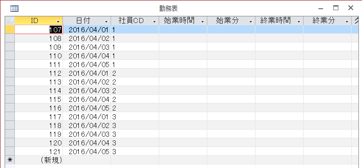 以前勤務表テーブルにデータを追加するときは、社員CDを入れずにいましたが、