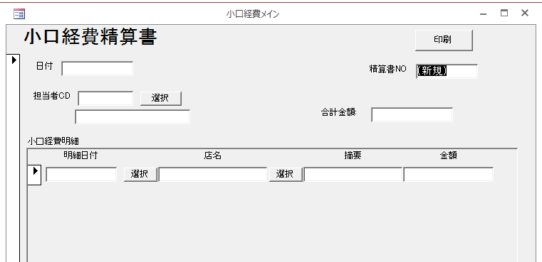 大枠となる精算書NO、日付、担当者を入れる「小口経費メインテーブル」