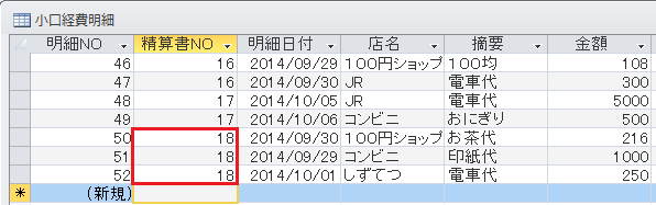 テーブルを見たときに、精算書NOフィールドが、小口経費メインテーブルと小口経費明細テーブルの