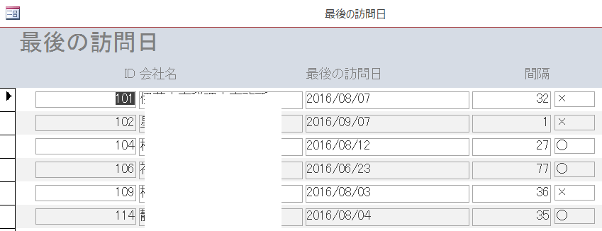 要否: IIf([間隔]>=[最低訪問間隔],”○”,”×”)