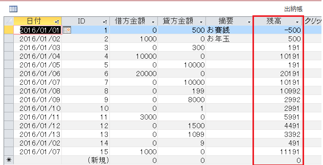 通常Accessで残高計算をする場合、一番手っ取り早い方法は、DSUM関数を使うこと