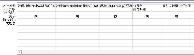 差引支給額: Nz([社保対象])+([その他手当2不課税])-Nz([社保合計])-Nz([源泉])-Nz([給与明細].[住民税])