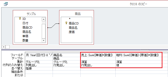 クロス集計クエリを次のように変更し、月ごとの粗利が出るようにします。