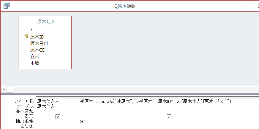 原木IDに対応するQ残原木の残りの原木(残原木)を求めるクエリです。