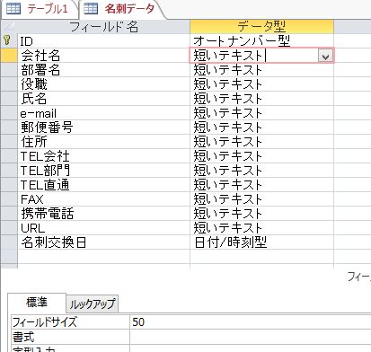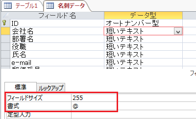 フィールドサイズを見ると、テキスト形式については短いテキストの最大のサイズで枠を