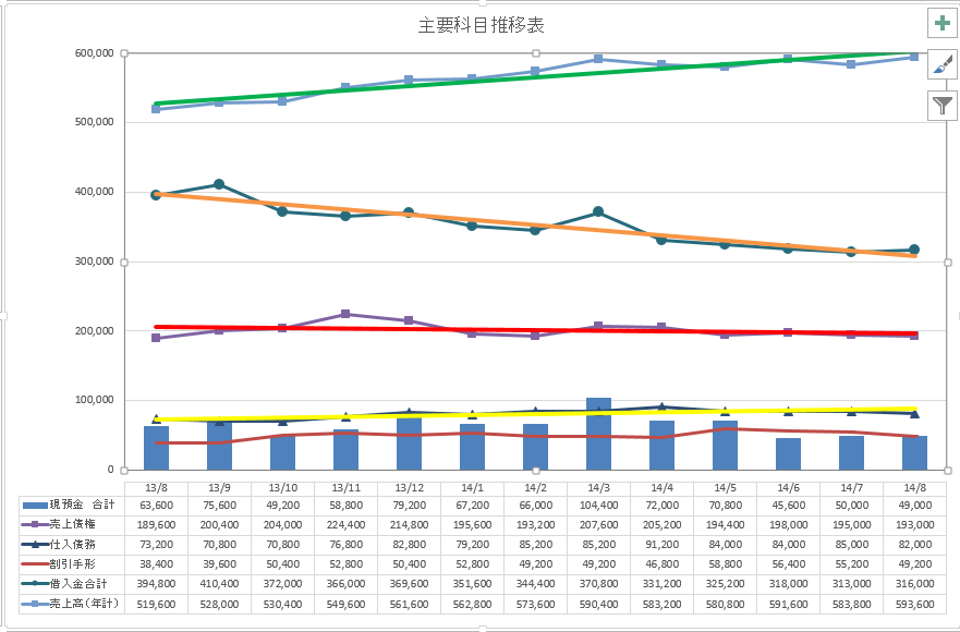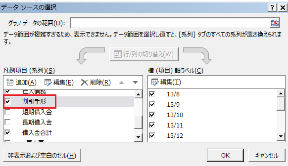 今回はグラフに「割引手形」の折れ線グラフを追加します。