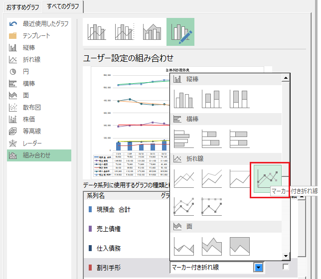 割引手形のグラフの種類を、「マーカーつき折れ線」に変更します。