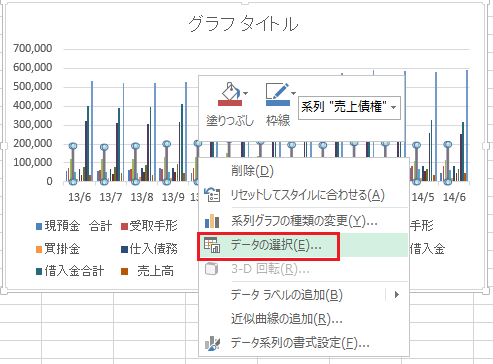 作成したグラフで右クリックし、データの選択をクリック。