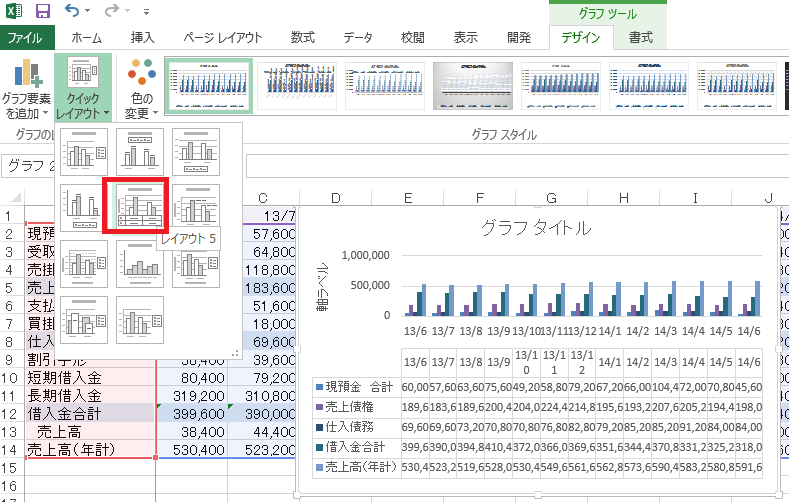 デザインタブのクイックレイアウトをクリックし、レイアウト5を選択します。